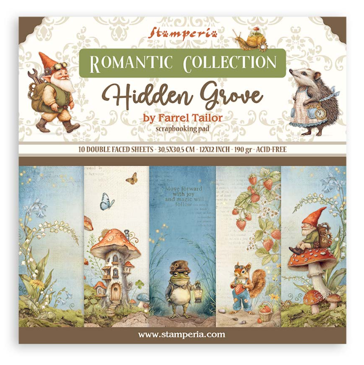 Hidden Grove, diseñado por Farrel Tailor para la Colección Romántica, te invita a un mundo boscoso y mágico lleno de encantadores gnomos, fresas y elementos naturales. Este bloc de papel incluye diez hojas de doble cara de 30 x 30 cm cada una, hechas de cartulina de alta calidad con un gramaje aproximado de 190 g/m². Los diseños incluyen flores, follaje, árboles, gnomos, setas, paisajes forestales, casas de gnomos y hadas, mariposas, ardillas, fresas, tejones, ramas, ranas steampunk y escenas nocturnas. También incluye tarjetas con las mismas imágenes: "Alegría", "Felicidad", "Para ti", "Maravilla", "Extraordinario" y "Hogar", junto con etiquetas con frases como "La felicidad está en las pequeñas cosas", "Un día hermoso", "Casa pequeña, grandes sueños", "Eres increíble" y "El hogar está donde está tu corazón".