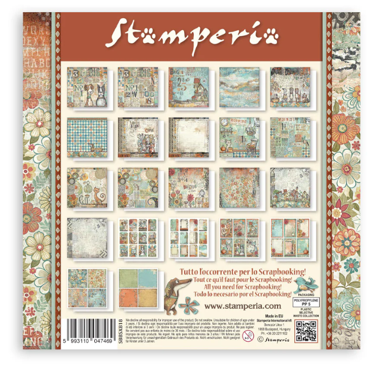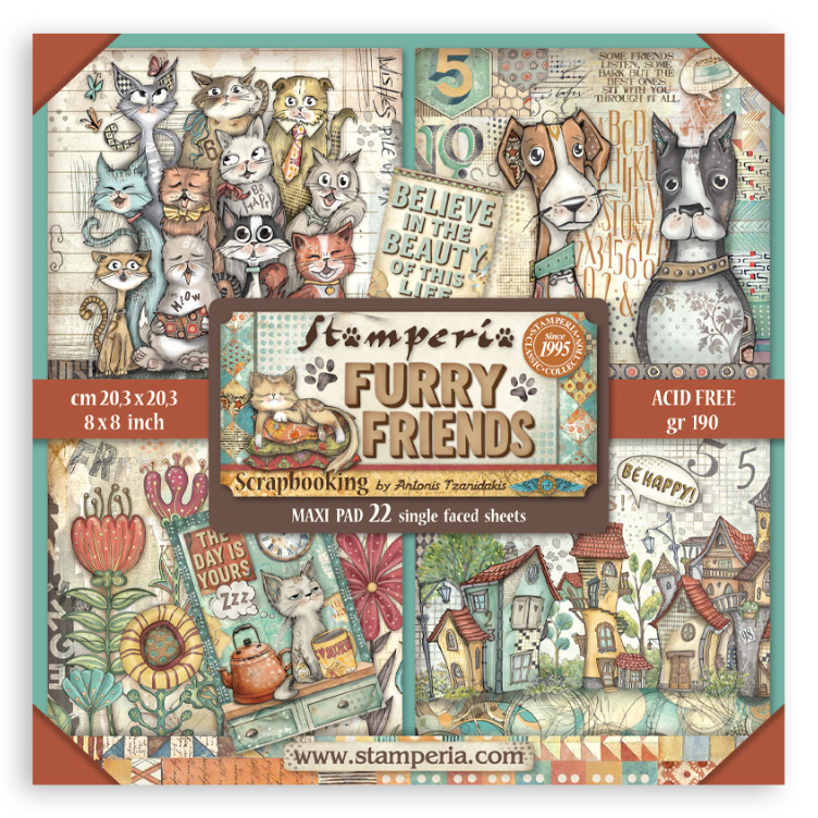 La colección «Amigos Peludos» de Stamperia, diseñada por Antonis Tzanidakis, celebra la alegría, la compañía y el encanto juguetón de las queridas mascotas. Este bloc de papel de 20 x 20 cm incluye 22 hojas impresas a una cara en cartulina de alta calidad de 190 g/m². Los diseños presentan collages originales de casas, gatos, perros, flores, texto, números y acogedoras escenas de interiores, junto con patrones y palabras a juego. También incluye tarjetas y etiquetas tamaño ATC con frases alegres como «El día es tuyo», «Sonríe», «Sueña», «La mañana es una dulce promesa», «Hogar, dulce hogar» y «Sé feliz».