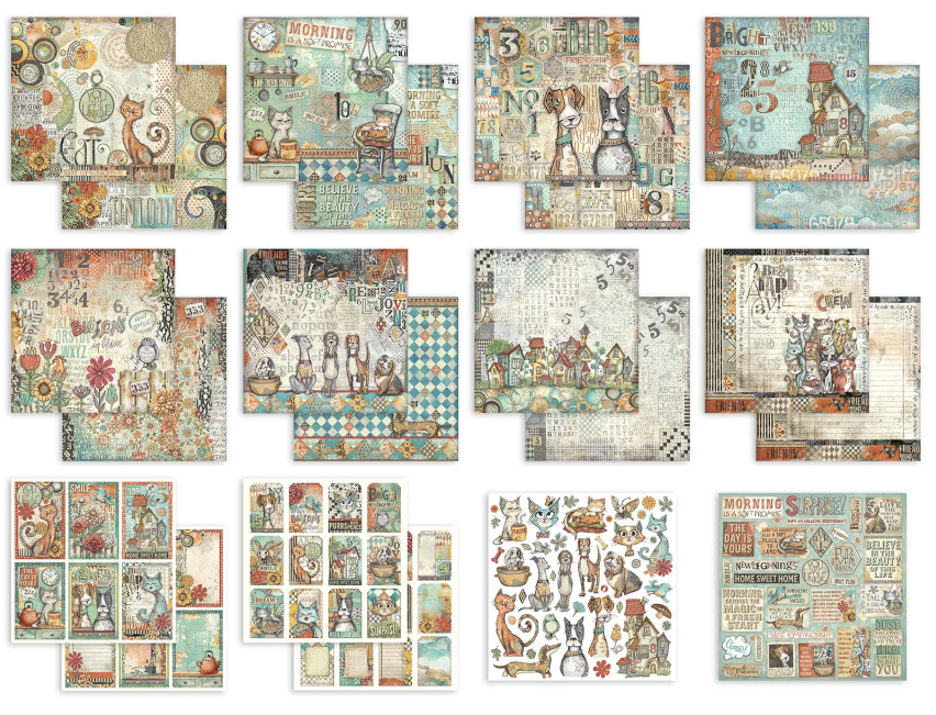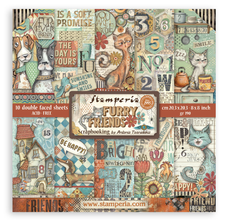 La colección «Amigos Peludos» de Stamperia, diseñada por Antonis Tzanidakis, celebra la alegría, la compañía y el encanto juguetón de las queridas mascotas. Este bloc de papel de 20 x 20 cm incluye diez hojas impresas a doble cara en cartulina de alta calidad de 190 g/m². Los diseños presentan collages originales de casas, gatos, perros, flores, texto, números y acogedoras escenas de interiores, junto con patrones y palabras a juego. También incluye tarjetas y etiquetas tamaño ATC con frases alegres como «El día es tuyo», «Sonríe», «Sueña», «La mañana es una dulce promesa», «Hogar, dulce hogar» y «Sé feliz».