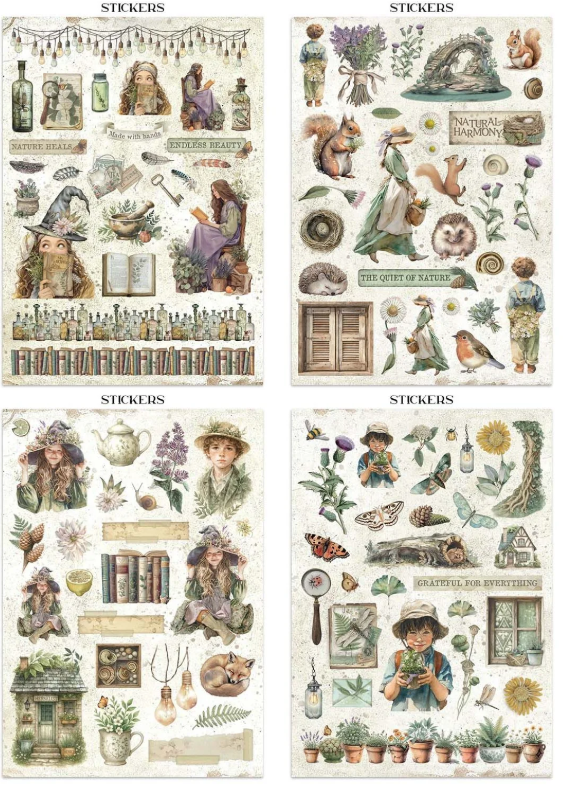 Las pegatinas presentan filas de libros, botellas o plantas, guirnaldas de luces, hierbas, pájaros, ardillas, flores, mariposas, ventanas, niños con sombreros florales, plumas, nidos, erizos, teteras, escaparates de herbolarios, etiquetas que dicen "La naturaleza cura", "Belleza infinita", "Armonía natural", "La tranquilidad de la naturaleza", "Hecho con las manos" y "Agradecido por todo".