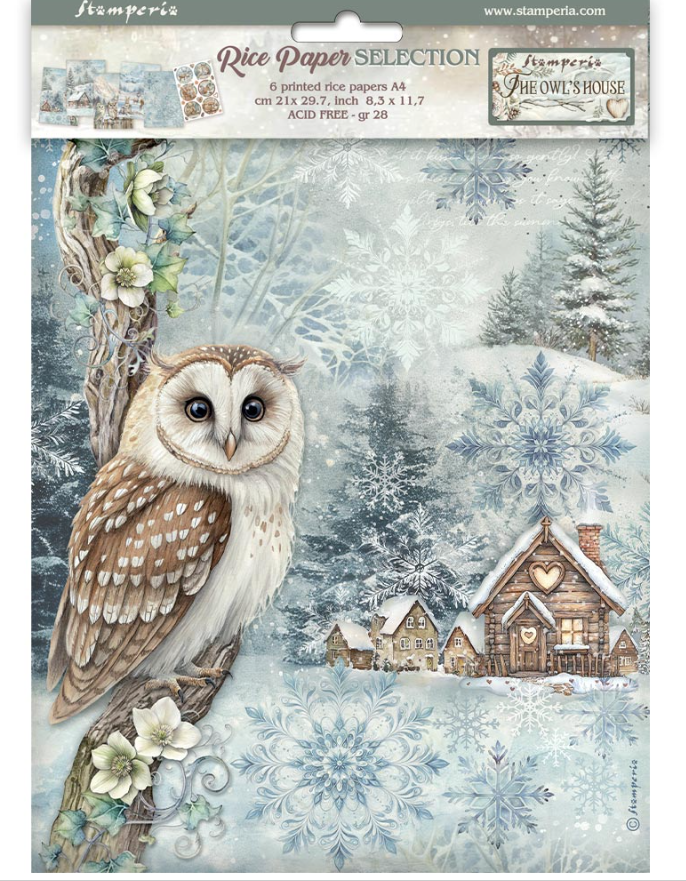 La colección La Casa del Búho está repleta de encantadores animales, paisajes nevados y la calidez rústica de las fiestas. Este paquete incluye seis hojas impresas de papel de arroz libre de ácido, cada una de aproximadamente 21 x 29,7 cm y 28 gramos. Perfectas para crear fondos cautivadores, estas hojas de papel de arroz son ideales para diarios, tarjetas, álbumes de recortes, técnicas mixtas y una variedad de proyectos de manualidades de temporada. Ligeras y fáciles de usar, se adhieren a cualquier superficie con tu adhesivo favorito para un acabado liso y uniforme. Los diseños presentan acogedoras escenas invernales, como cabañas nevadas, búhos posados en una cerca, ciervos y conejos frente a majestuosas montañas nevadas, delicados copos de nieve y círculos decorativos con postres, ositos de peluche y animales del bosque. Los diseños incluyen frases como: «Deseos de Invierno», «Silencio Helado», «Beso de Nieve», «Hogar, Dulce Hogar», «Bienvenido» y «Que la Alegría te acompañe», que añaden un toque entrañable a tus manualidades invernales.