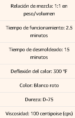 - Tiempo de secado rápido: con Model-Pro, puedes completar tus proyectos en solo 15 minutos. Su rápido tiempo de curado lo hace compatible con moldes de resina de silicona vulcanizada a temperatura ambiente o RTV.