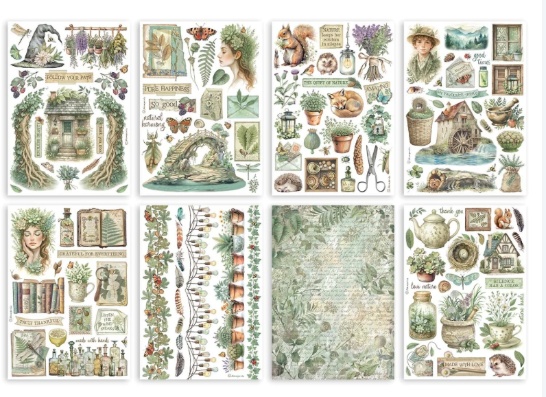 Stamperia Herbarium Silvae, diseñado por Cristina Radovan, revela lo que yace más allá de la superficie de la naturaleza: su belleza serena, su esencia y la conexión entre todo. Este bloc washi incluye 8 hojas translúcidas A5 (aproximadamente 14,7 x 21 cm), ideales para superponer y para superficies de colores claros. Estas hojas decorativas se recortan fácilmente con el cortador de cerámica KRT17. Los diseños incluyen hierbas colgantes, ventanas y contraventanas, cabañas, molinos de agua, puentes, terrarios, libros, follaje, ardillas, zorros, erizos, conchas, botellas, flores, guirnaldas de luces, plantas en maceta, hiedra, plumas, teteras, troncos, mariposas y otros insectos, rostros etéreos y mucho más. Las etiquetas dicen “Sigue tu camino”, “Belleza infinita”, “Gracias árboles”, “Pura felicidad”, “tan bueno”, “armonía natural”, “La tranquilidad de la naturaleza”, “La naturaleza guarda su sabiduría en silencio”, “Mis cosas favoritas”, “Agradecido por todo”, “El silencio tiene un color” y “Hecho con amor”.
